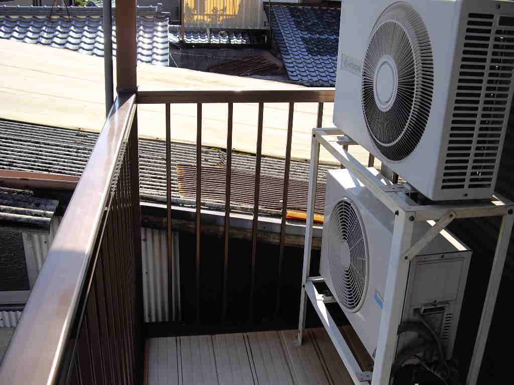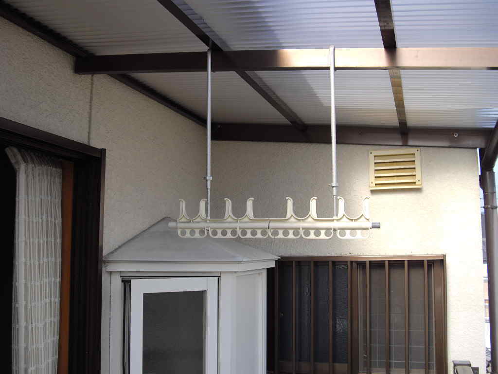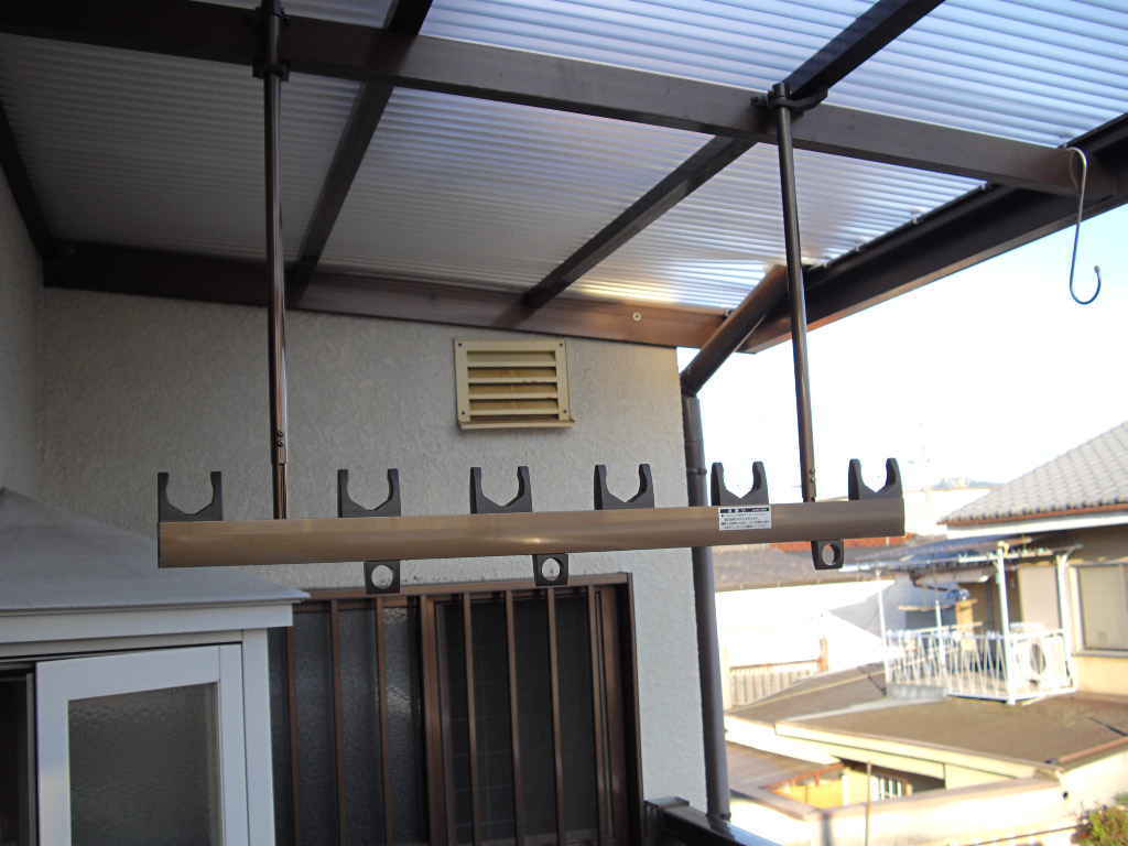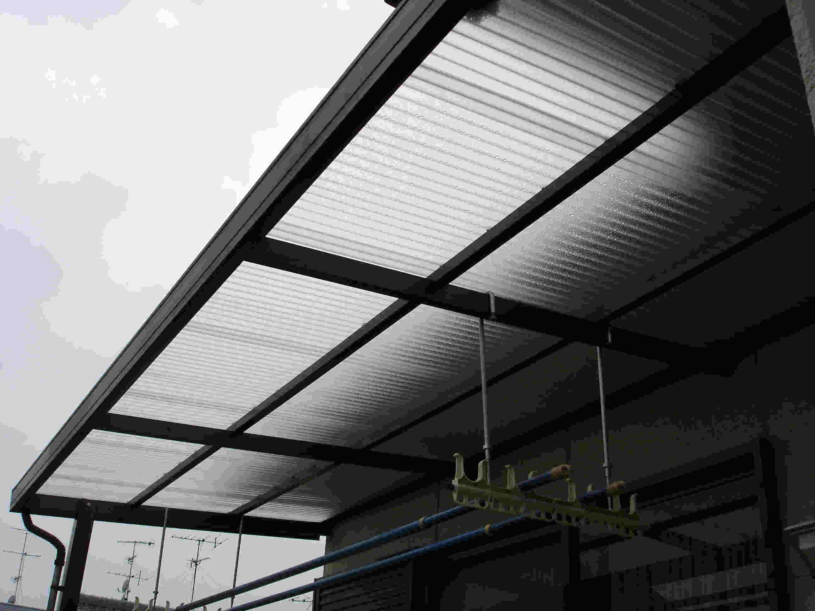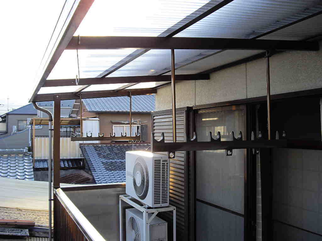 | 京都伏見の有限会社 久我製作所 エクステリア アルミ ベランダ 屋根 物干し金物 波板 ボリカ アルミ製ベランダ 改修工事 京都府 E様邸 京都の居宅のアルミ製ベランダ(物干し)の改修工事のご依頼を頂きました。 劣化している屋根の波板と物干し金物の交換。 また、ベランダ側面から雨が入ってくるので 『ステンレスパネル』を 雨よけに張りました。 ![]() 施工前の屋根。 波板が、劣化して割れてきています。 ![]() 施工後の屋根。 ポリカ材の波板に変更。 色は、クリアーすりガラス。 お客様のご意向どおり明るくなりました。