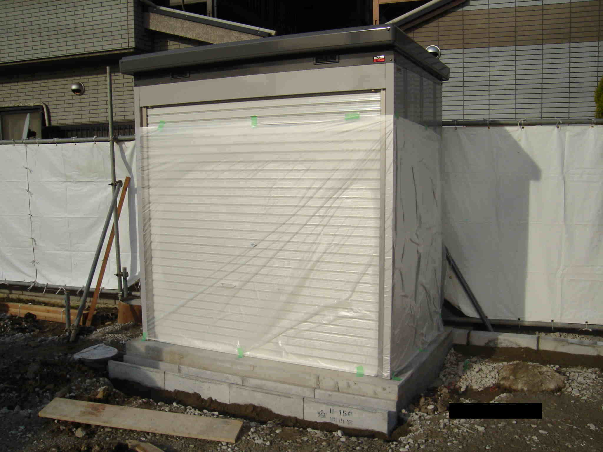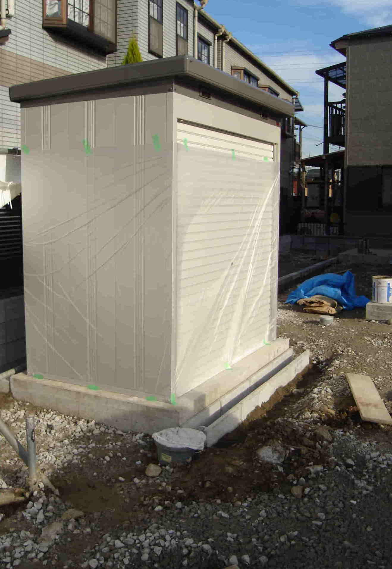 | 京都伏見の有限会社 久我製作所 エクステリア工事 イナバ物置 外構 製作 設計 施工 販売 エクステリア工事 イナバ物置設置 京都府 飲食店 外部物置設置 「活葉製作所」製 物置設置後にアスファルトを舗装するため、養生しています。 |