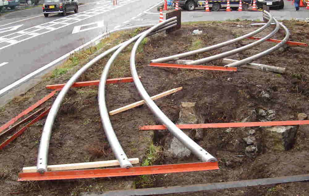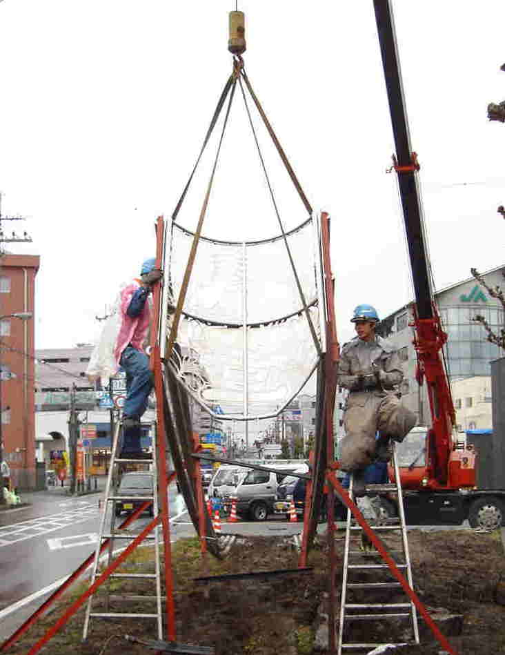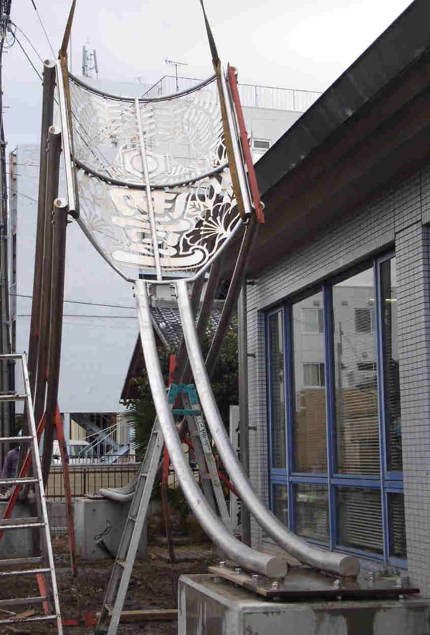 | 京都伏見の有限会社 久我製作所 ステンレスモニュメント 移設工事 建築金物 装飾金物 製作 設計 施工 販売 ステンレス製モニュメント 移設工事 滋賀県 既存のSUS製・HL・モニュメントの移設。 解体・運搬・組み立て、最後に補強のためパイプにモルタルを流し込みます。 ![]() 移設前。移設後に同じ状態にするため、各所の寸法を取っておきます。 ![]() 解体作業。解体・運搬中にパイプが折れてしまわないよう、各所補強を仮につけていきます。 ![]() ![]() ![]() 運搬。慎重に運びます。 ![]() 組み立て。移設前に測った寸法で組み立てます。 太いパイプの先端に穴を開け、モルタルを流し込んだ後復旧。 各所につけていた補強も外し、HLに仕上げました。 |