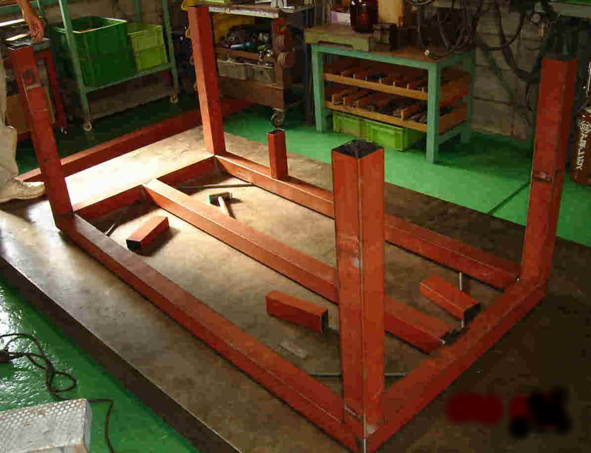 鉄の角パイプ・アングルで架台を作り、天板には厚み12ミリの鉄板を貼りました。