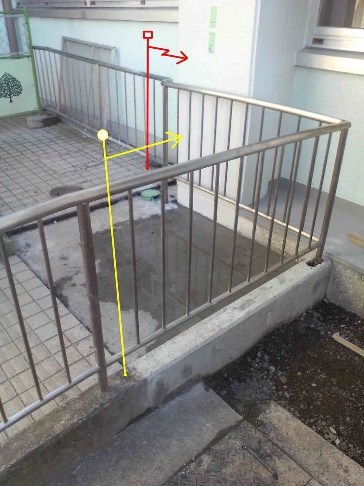 学校の耐震補強工事のため、 既存スロープの手摺りを一部撤去。